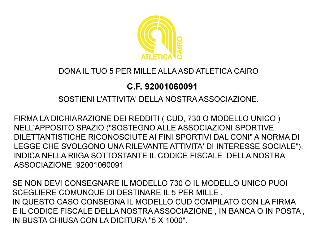 L’Associazione Sportiva Dilettantistica “Atletica Cairo” nasce nel marzo 1980 per aggregazione spontanea di amanti dell’atletica leggera. Nel corso di questi anni l’Associazione ha partecipato con i suoi atleti a competizioni in ogni parte d’Italia e all’estero, ottenendo risultati di importante rilievo.